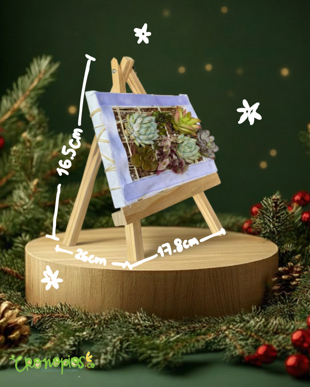 Descubre el Terrario - Lienzo Mi Jardín 1, un minijardín de suculentas único, creado en un lienzo que incluye el tripié de soporte. Fácil de cuidar, es la inspiración perfecta para darle un toque natural y acogedor a tu hogar u oficina. ¡Ideal para los amantes de las plantas! Es una pieza única.